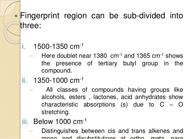 It would be helpful if you first read the introductory page on infra red spectra if you havent already done so. Ir spectrum table by frequency range. The ir spectrum table is a chart for use during infrared spectroscopy. Fingerprint region in ir spectroscopy are the regions where all the bending vibrations are seen in spectroscopy.